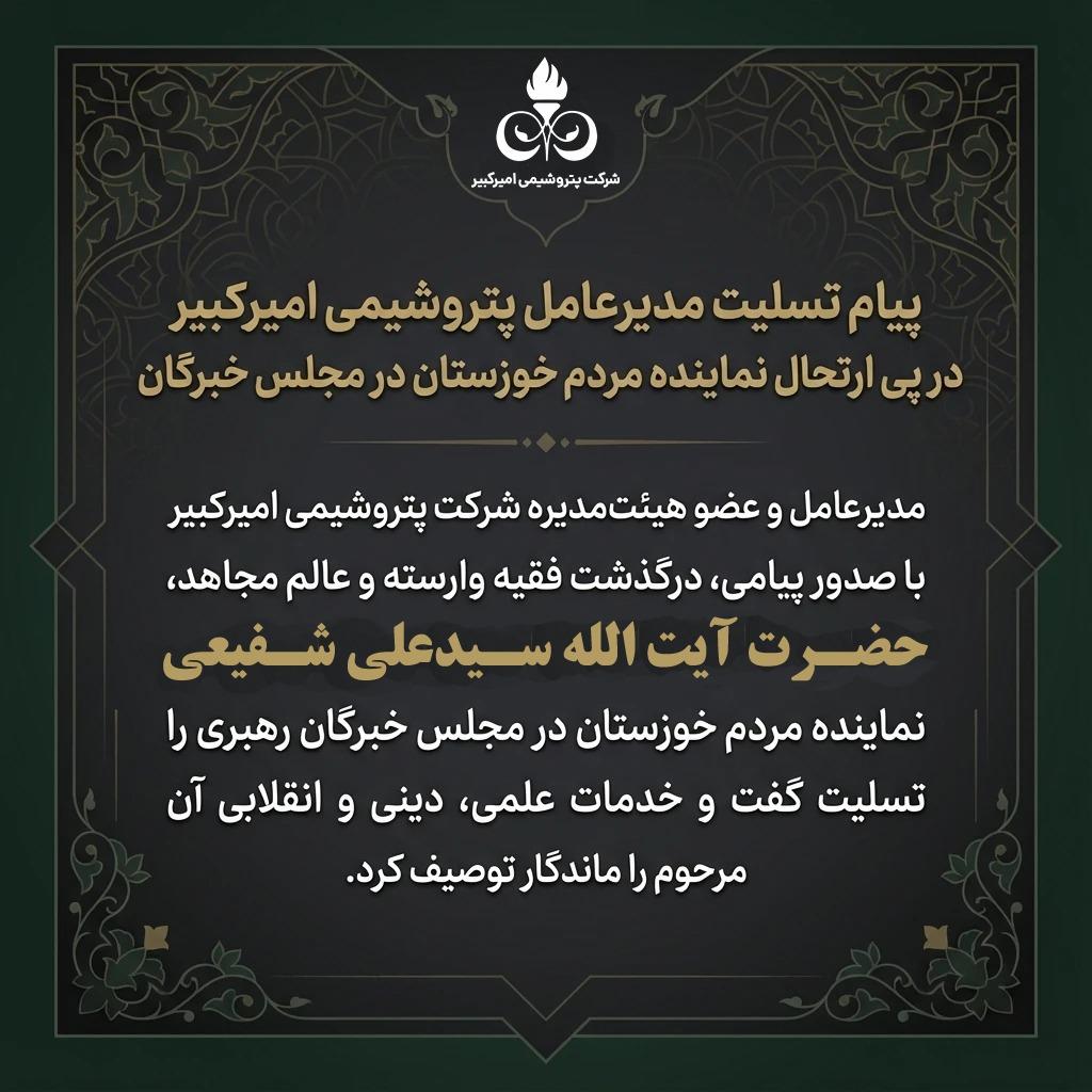 سرپرست و عضو هیئتمدیره شرکت پتروشیمی امیرکبیر با صدور پیامی، درگذشت فقیه وارسته و عالم مجاهد، حضرت آیتالله سیدعلی شفیعی نماینده مردم خوزستان در مجلس خبرگان رهبری را تسلیت گفت و خدمات علمی، دینی و انقلابی آن مرحوم را ماندگار توصیف کرد.